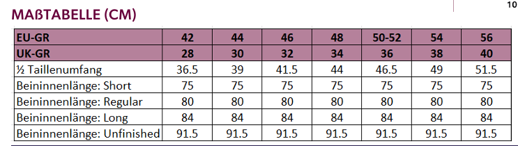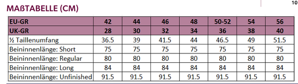 Auf Wunsch liefern wir die Hose in folgenden Längen: 75 cm, 80 cm, 84 cm oder mit offenem Saum (91,5 cm). Bitte geben Sie die gewünschte Länge im Bemerkungsfeld an.