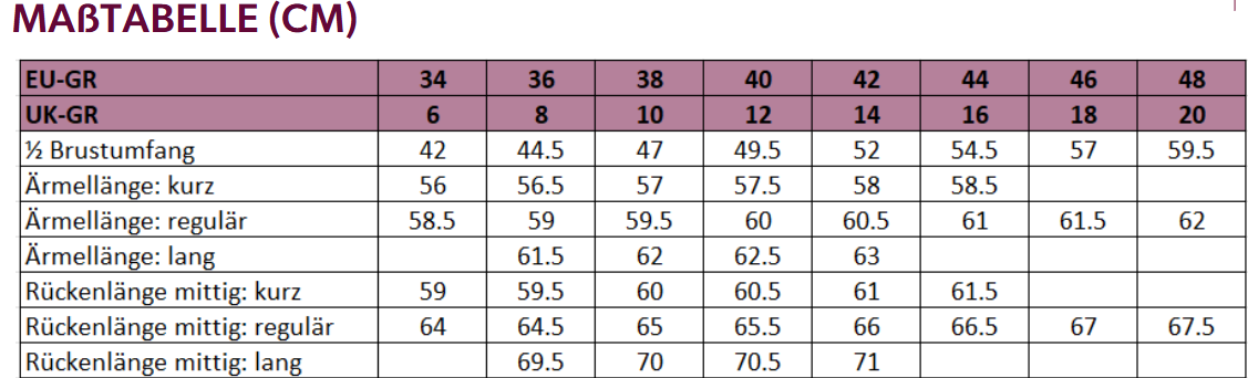 • Rückenlänge bei Gr. 40R = 65,5cm